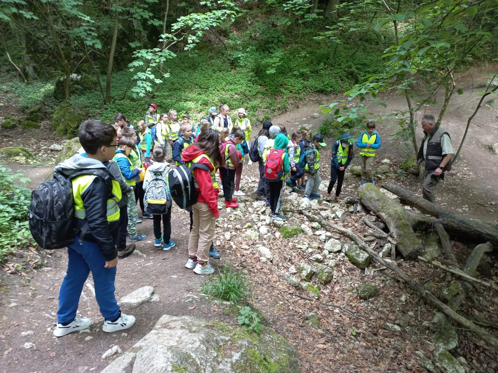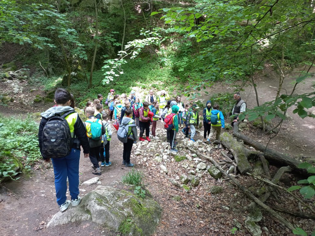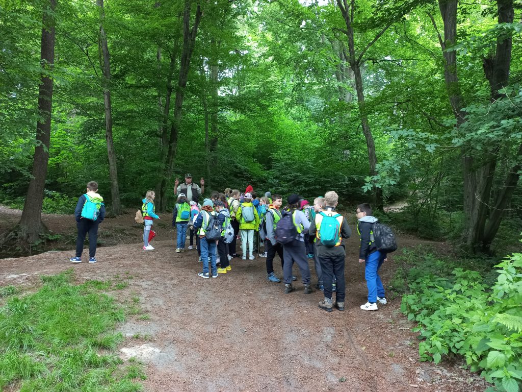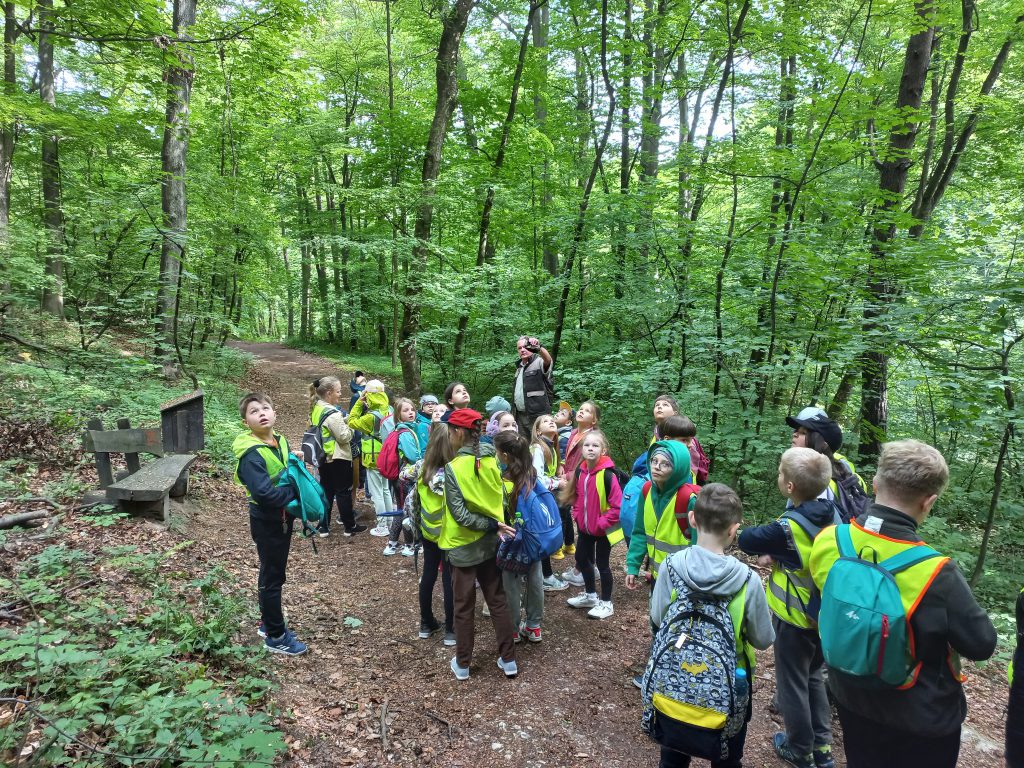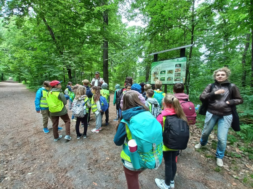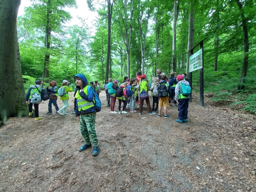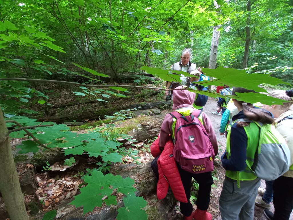Dzieciaki wyruszyły na wędrówkę ścieżką przyrodniczą Baba Jaga-Panieńskie Skały-Polana Sowiniec. W sekrety przyrodnicze Lasu Wolskiego wprowadził dzieci Pan Zbigniew – leśnik, który doskonale każdy fragment tego pięknego lasu.