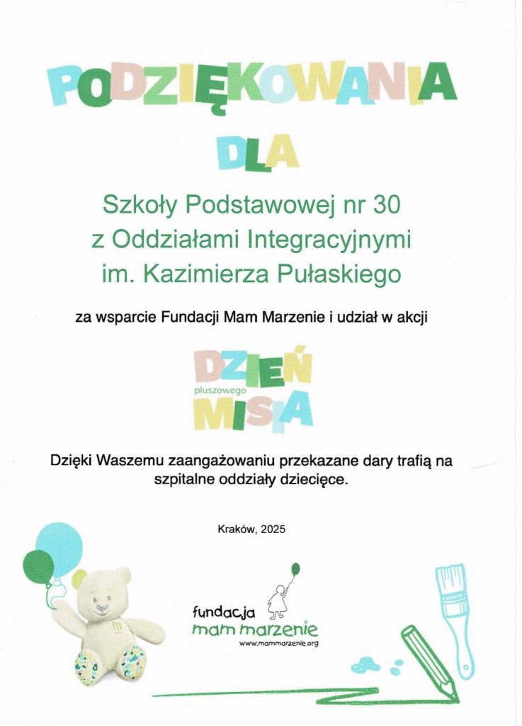 Nasza szkoła włączyła się w ogólnopolską akcję charytatywną Fundacji Mam Marzenie z okazji Dnia Pluszowego Misia.  Uczniowie przynieśli nowe pluszaki, gry , książki, materiały plastyczne, które zostały przekazane dzieciom przebywającym w szpitalach.