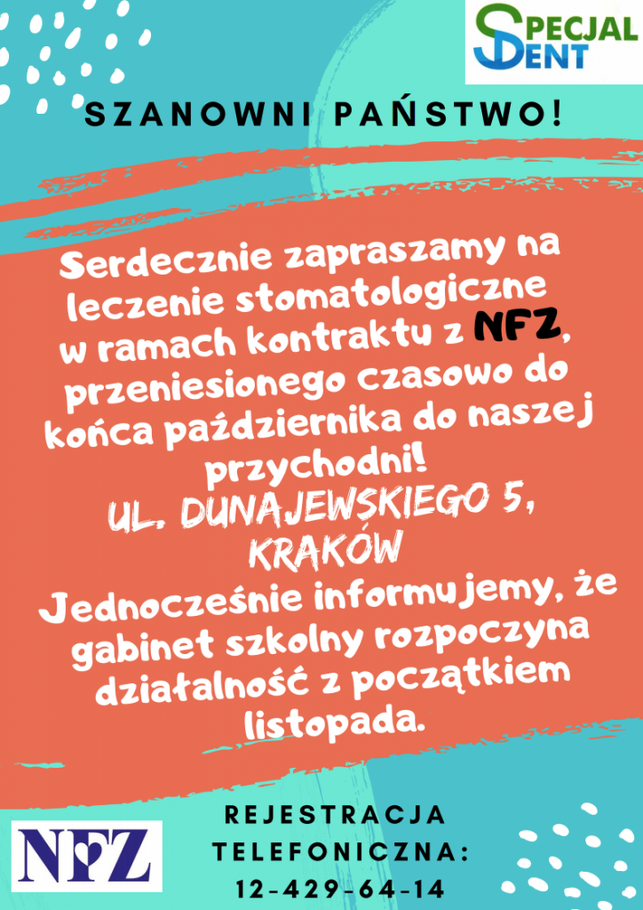 Gabinet stomatologiczny w Szkole Podstawowej nr 25 w Krakowie wznowi swoją działalność od miesiąca listopada b.r. Do końca października w ramach NFZ można skorzystać z usług dentystycznych w przychodni, ul. Dunajewskiego 5.
