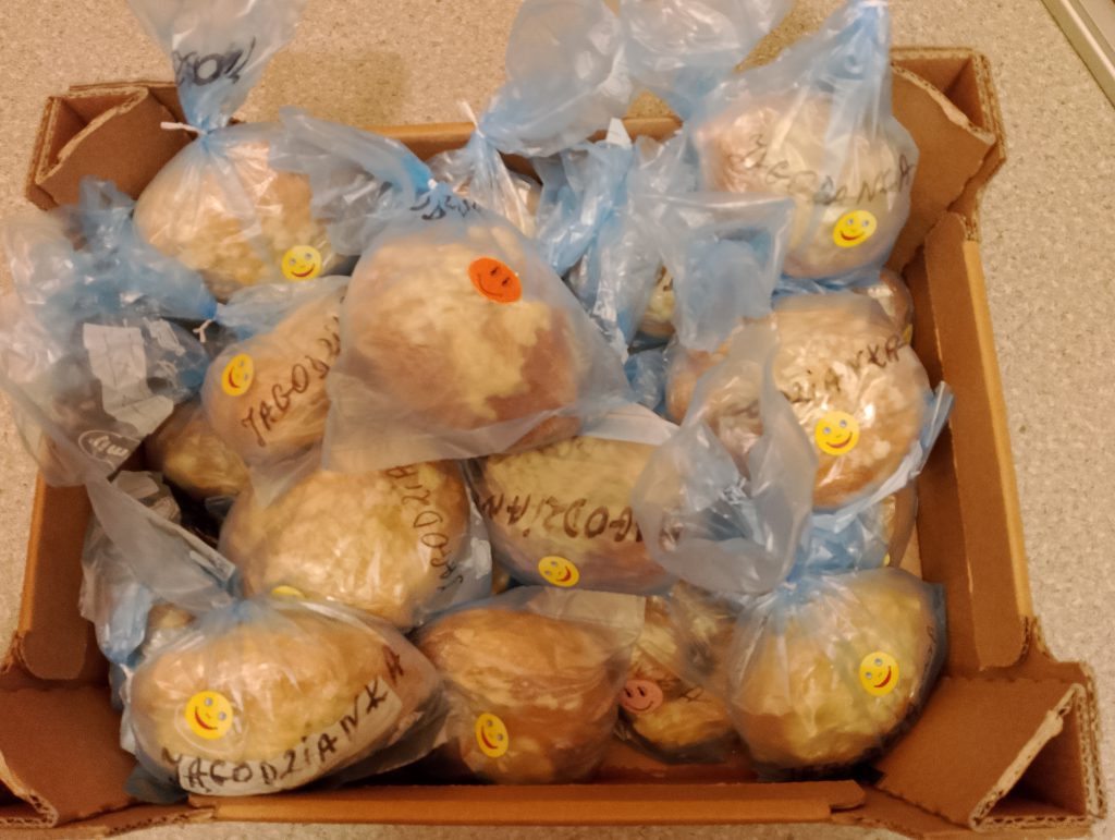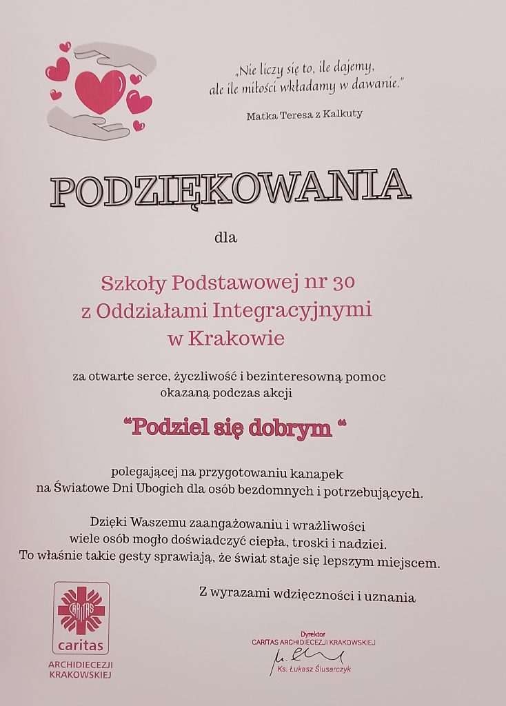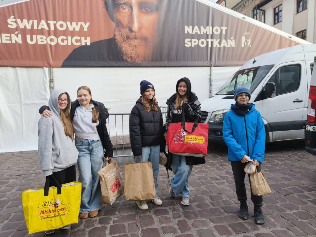 W dniu 14.11.2025 r. wolontariusze Szkolnego Koła Caritas oraz uczniowie naszej szkoły włączyli się w akcję przygotowań 100 kanapek z okazji IX Światowych Dni Ubogich w Krakowie.