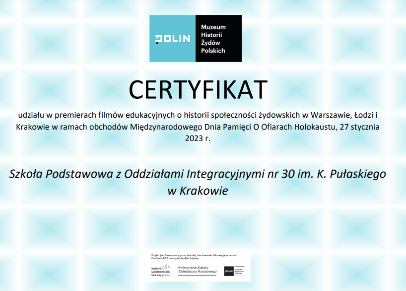 W Międzynarodowy Dzień Pamięci o Ofiarach Holokaustu – 27 stycznia – odbyły się premiery filmów edukacyjnych o historii społeczności żydowskiej w Łodzi i Krakowie w reżyserii Łukasza Kamila Kamińskiego. Nasza Szkoła włączyła się w akcje Muzeum Historii Żydów Polskich.