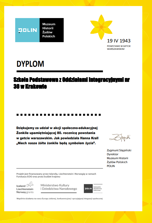 Klasy 8 wzięły udział w ogólnopolskiej akcji Żonkile. Przypomnieliśmy historię holocaustu i powstania w getcie warszawskim. Obejrzeliśmy także animacje „Zdążyć przed Panem Bogiem” przygotowaną przez Muzeum POLIN .